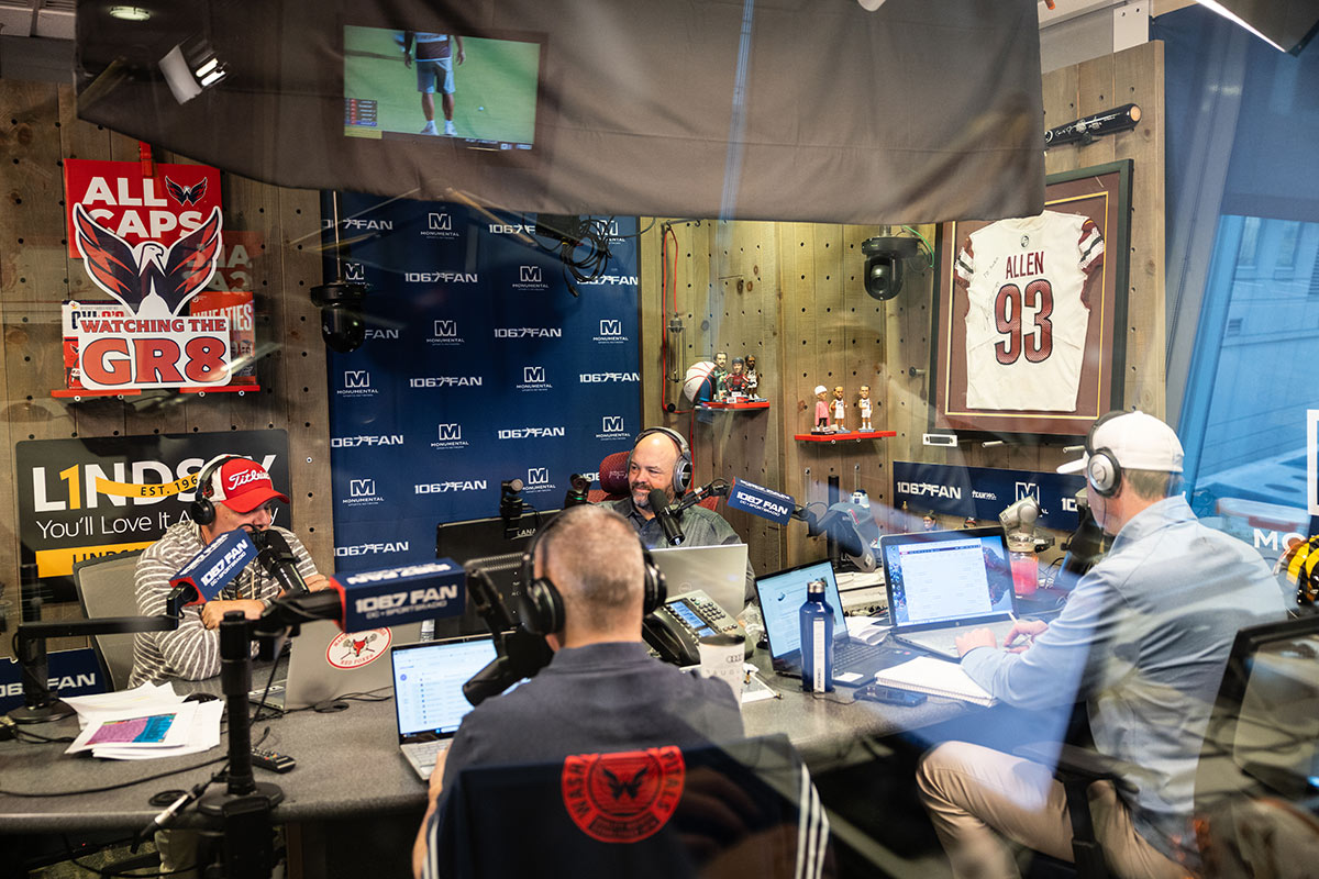 They’re also on television. Their morning show is aired live on Monumental Sports Network, which has unobtrusive cameras stationed around the studio. The studio is kitted with simulated wood and brick, framed game jerseys, and innumerable sports bobbleheads that keep an eye on the proceedings. The Junkies, wearing headphones, sit with laptops and printouts at microphones around a table.