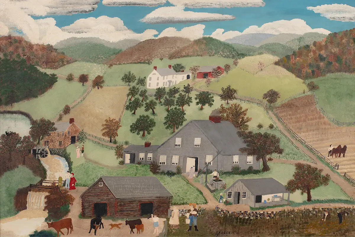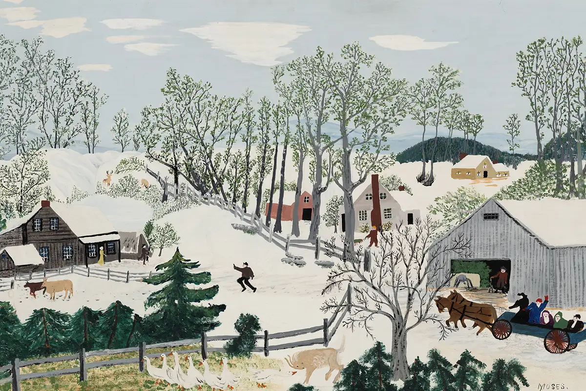 It’s fitting that a new exhibition on the work of American artist Anna Mary Robertson “Grandma” Moses opens on November 25 at the Smithsonian American Art Museum (SAAM) — right before the holiday season. After all, many of Moses’ primitive landscapes focus on holiday traditions and preparations like fall harvests, tables set for feasts, horse-drawn sleighs loaded with cut evergreens, and even Santa and his reindeer flying over a snowy, moonlit valley.