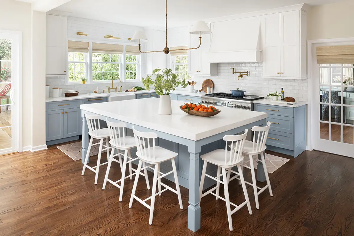The rectangular island, with white quartz counters and furniture-style legs, has become a favorite gathering place for the family. The peripheral custom cabinetry in full overlay Shaker style sports a dual palette of creamy white upper cabinets and soft blue lower cabinets, while handmade subway tiles travel up the walls.